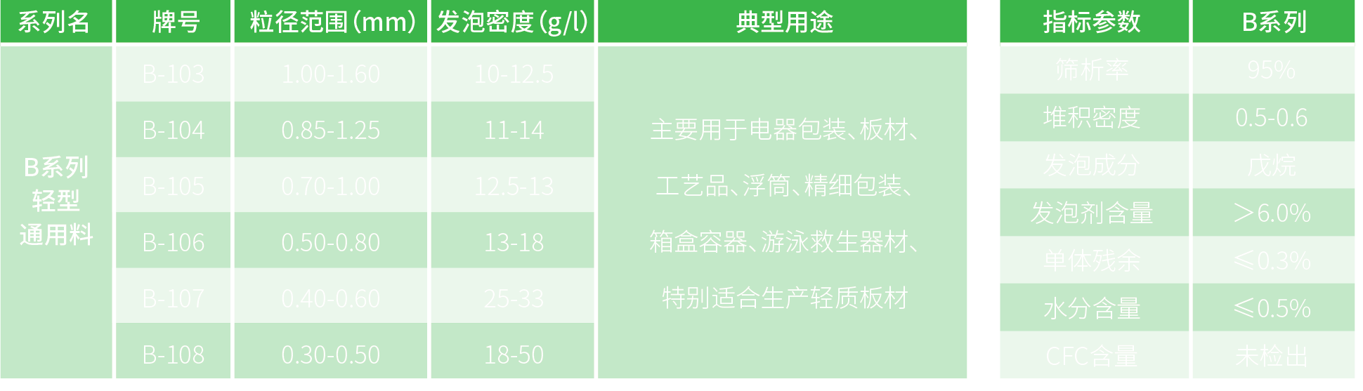 Product characteristics: B series EPS material is light general-purpose raw material, which can be foamed at a time to achieve lighter weight. It is more suitable for multiple foaming to obtain lighter foamed plastic products, so it is more suitable for primary foaming 18g/L. Hereinafter, a product of 10 g/liter or less is foamed a plurality of times. This series of products has high foaming rate, fast foaming speed, low energy consumption and resource saving. The curing time and molding cycle are short, and it has the characteristics of quick rebound, which is suitable for baking-free lightweight packaging. The product has good sintering property, smooth surface, stable material property, strong applicability, and the product is not easy to shrink.