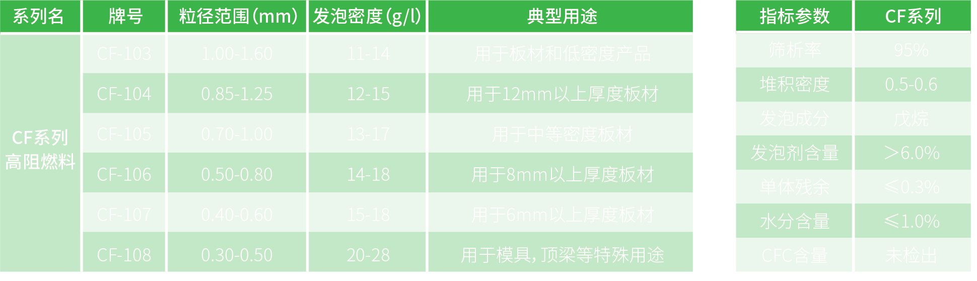 Product characteristics: CF series EPS material is a high flame retardant material. The product has passed the UL laboratory accreditation (certification number E248974) and the Dujiangyan National Fireproof Building Materials Quality Inspection Center B1 certification. This series of products has more excellent flame retardant properties, high expansion ratio and high speed. The obtained product has low shrinkage rate and wide operating range during processing, and is suitable for various plates, automatic machines, manual presses and the like.